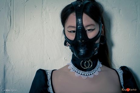 Club Rubber Restrained: Asian maid in latex uniform strips and shows her big booty and tits